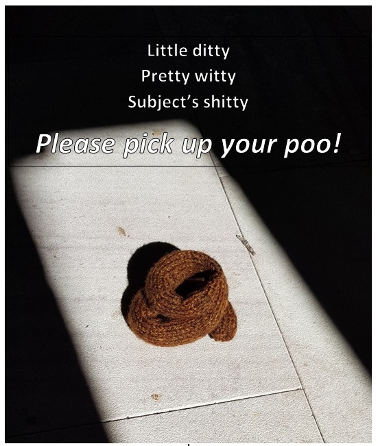 Neighbourhood Watch Ku-ring-gai & Hornsby designed a ‘Pick up Your Poo‘ poster to make a difficult topic easier, by using humour to convey the important message. We envisage this poster for use when unknown inconsiderate dog owners regularly frequent a particular area and require a reminder from residents.