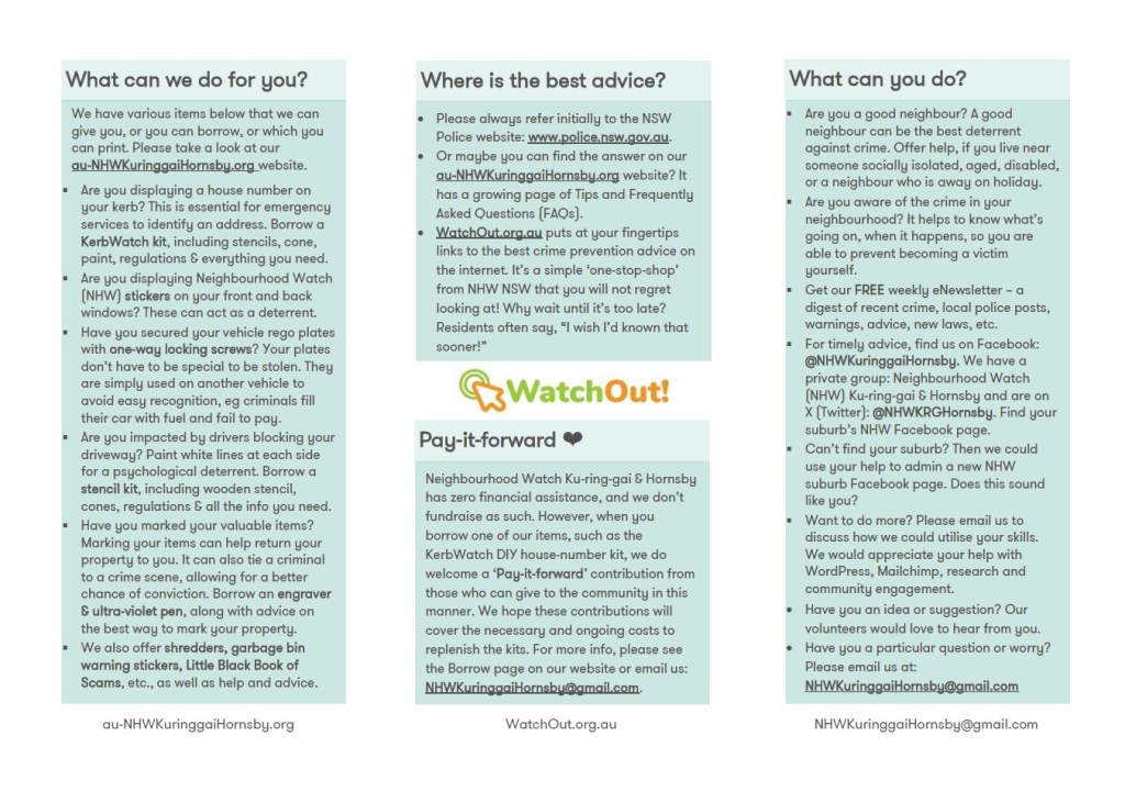Every organisation has a brochure. Neighbourhood Watch Ku-ring-gai & Hornsby’s can be downloaded as a pdf to your computer, for later printing. Please read about the work of volunteers in the ‘Neighbourhood Watch Ku-ring-gai & Hornsby’ brochure and especially how we can help you.